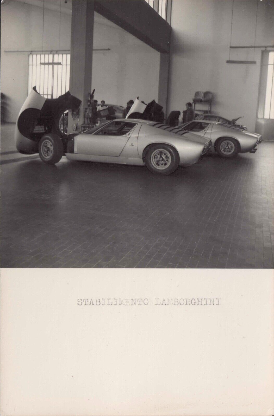 Extremely rare original press photo a pair of early Lamborghini Miuras in the factory circa 1966. Very good condition. Measures 18x12 CM.