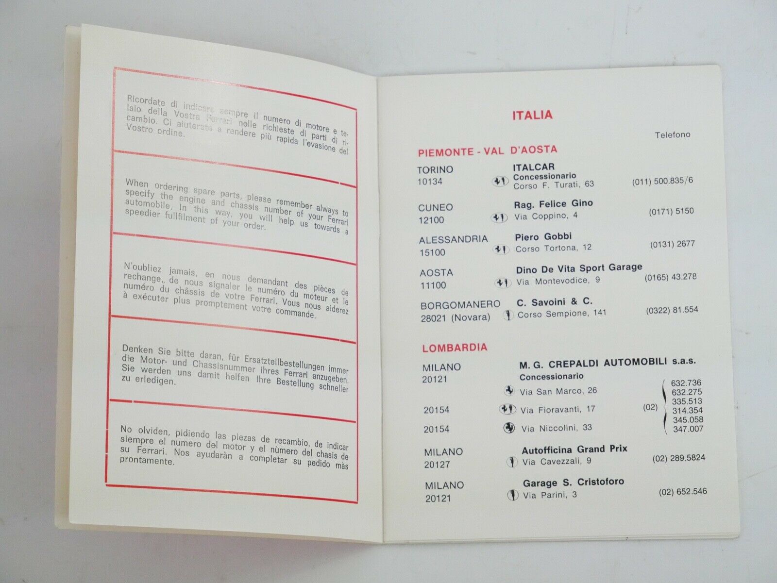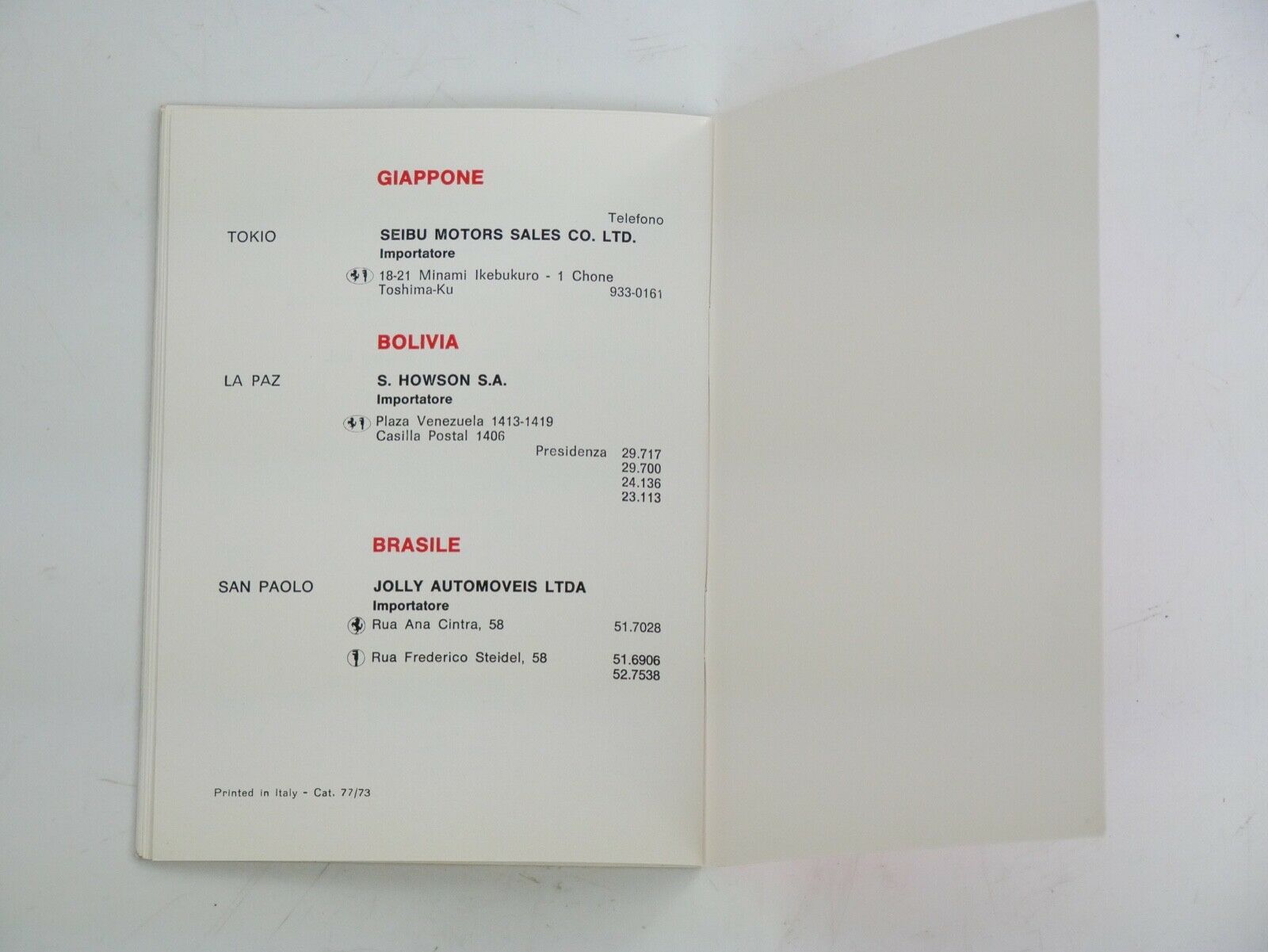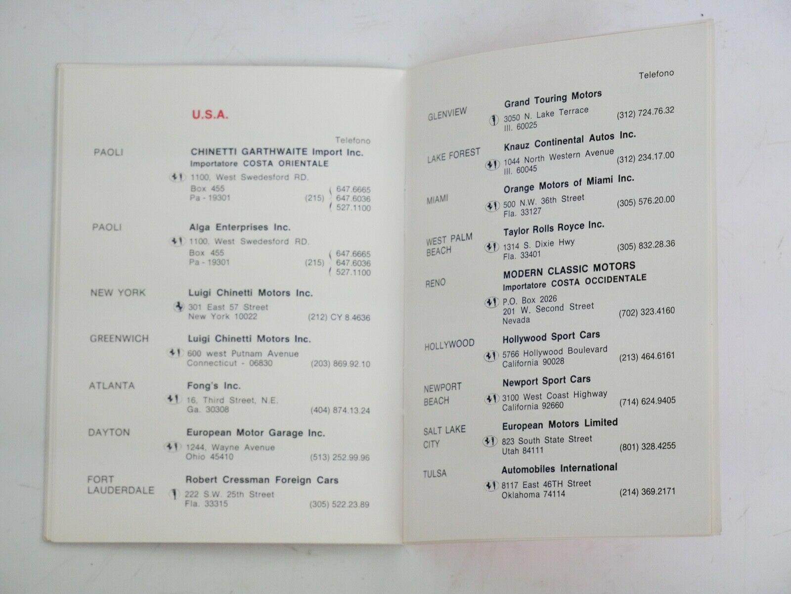 An original 1973 Ferrari dealer directory as supplied with all 1973 production cars. Perfect condition, like new!