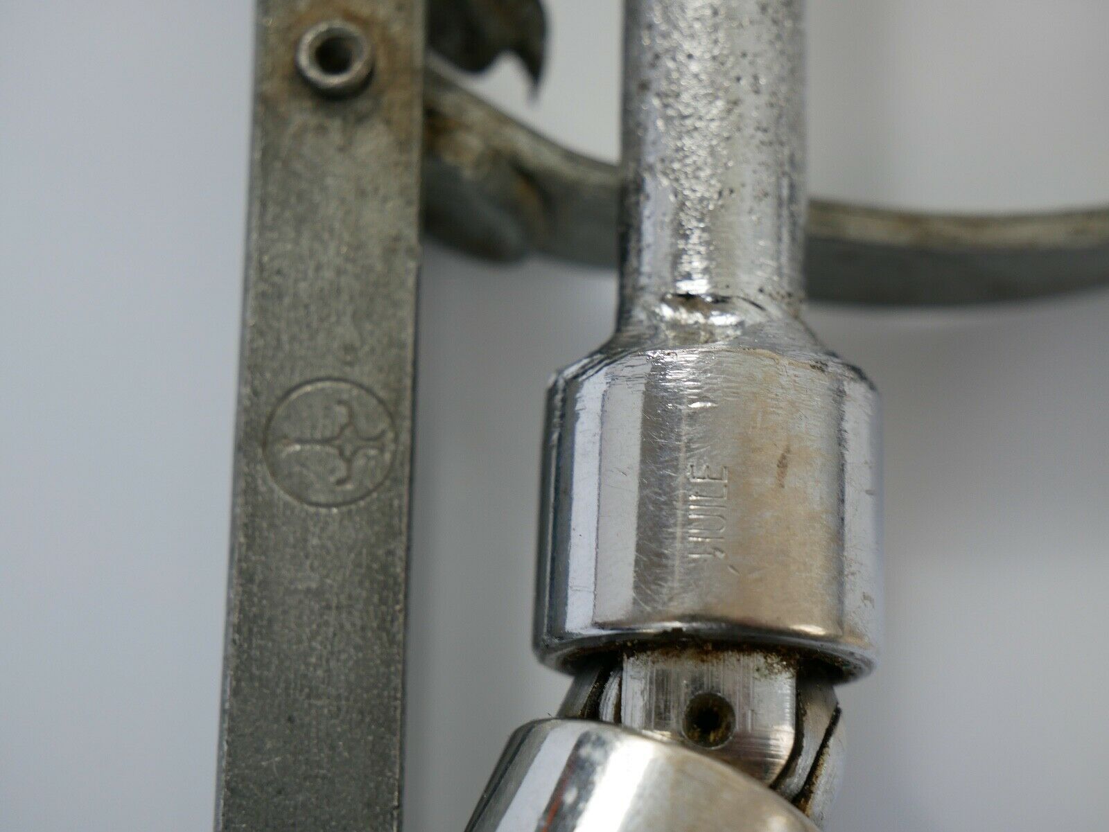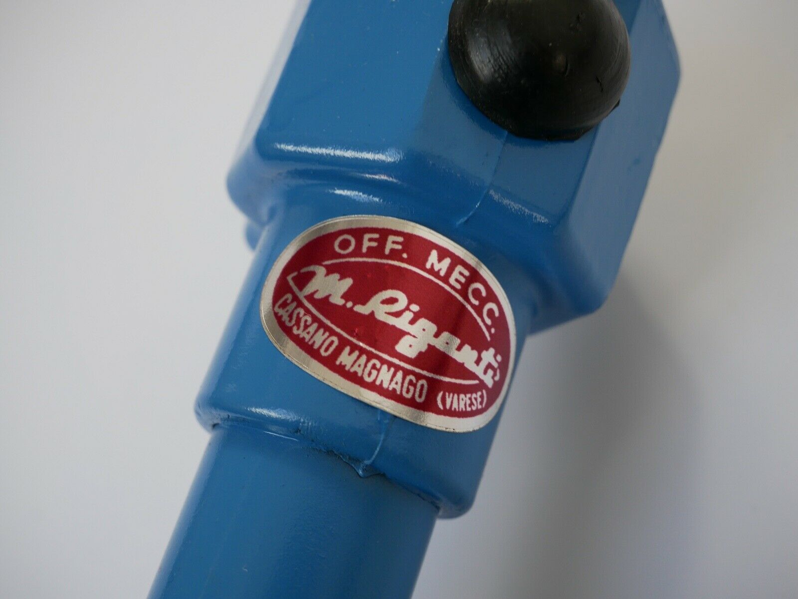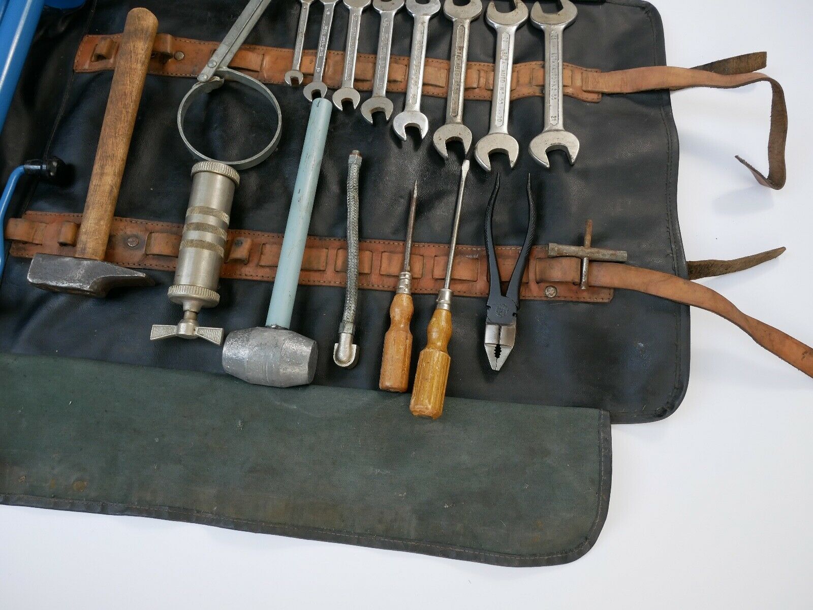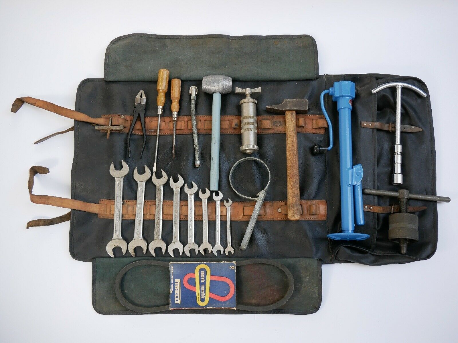 1) Original textured vinyl and leather tool roll in excellent shape. All of the straps, buckles and handle are original and in lovely condition - leather is soft with no tears. There are two very small nicks to the vinyl and the odd mark here and there commensurate with the items age. 2) Original M. Riganti jack, professionally restored and operational. 3) Original front hub puller size 42 4) Original spark plug wrench 5) Original Carello oil filter wrench 6) Original grease gun with flexible steel hose 7) Original 190MM pliers, with black cross hatched handles and polished snout 8) Original 8x Beta-Auto No. 55 wrenches 8-23mm 9) Original 2x wood handled screwdrivers with blade lengths of 125mm and 150mm 10) Original Weber jet key 11) Original 500 gram mechanic’s hammer 12 ) Original restored lead mallet 13) Original Pirelli fan belt
