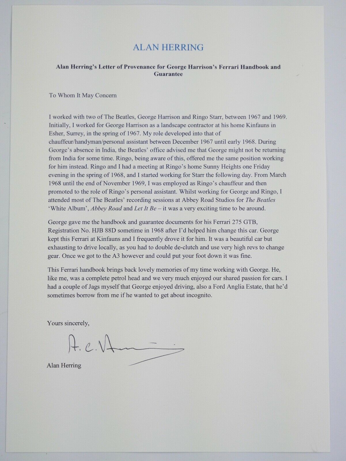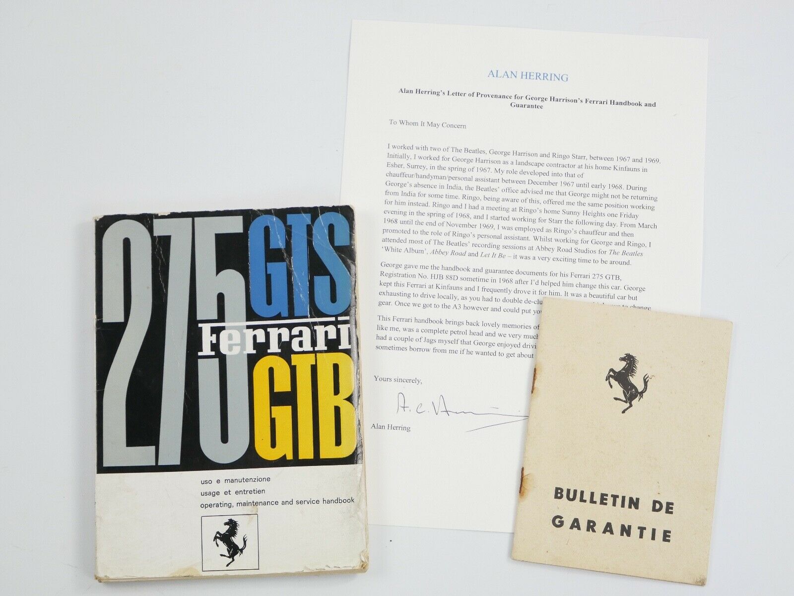 A unique piece of The Beatles and Ferrari history - the original handbook and warranty card from George Harrison's Ferrari 275 GTB *07789*, which Harrison bought new in 1965 and owned for several years during the zenith of The Beatles' success. This came from the estate of Alan Herring, Harrison's chauffeur. Everything is in good condition and a charming letter of provenance signed by Herring is included.